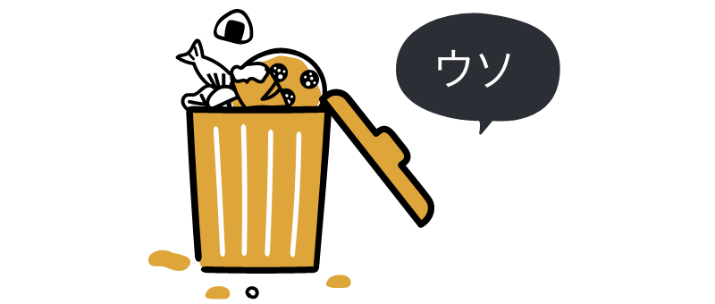 日本では、一年間で約472万トンもの食べ物が捨てられているよ。これは日本で暮らす人、一人の分量に換算すると、年間約38kg。毎日、約おにぎり1個分のご飯に近い量を捨てていることになる。残さず・無駄にせず食べるようにしよう。