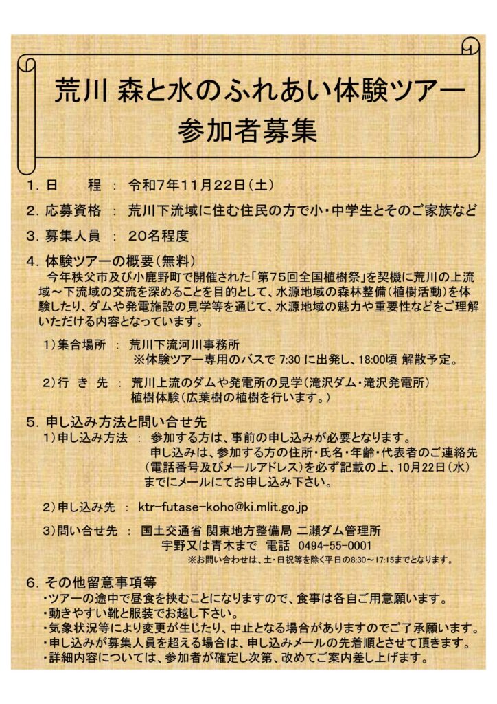 今年秩父市及び小鹿野町で開催された「第75回全国植樹祭」を契機に荒川の上流域~下流域の交流を深めることを目的として、水源地域の森林整備(植樹活動)を体験したり、ダムや発電施設の見学等を通じて、水源地域の魅力や重要性などをご理解いただける内容となっています。
