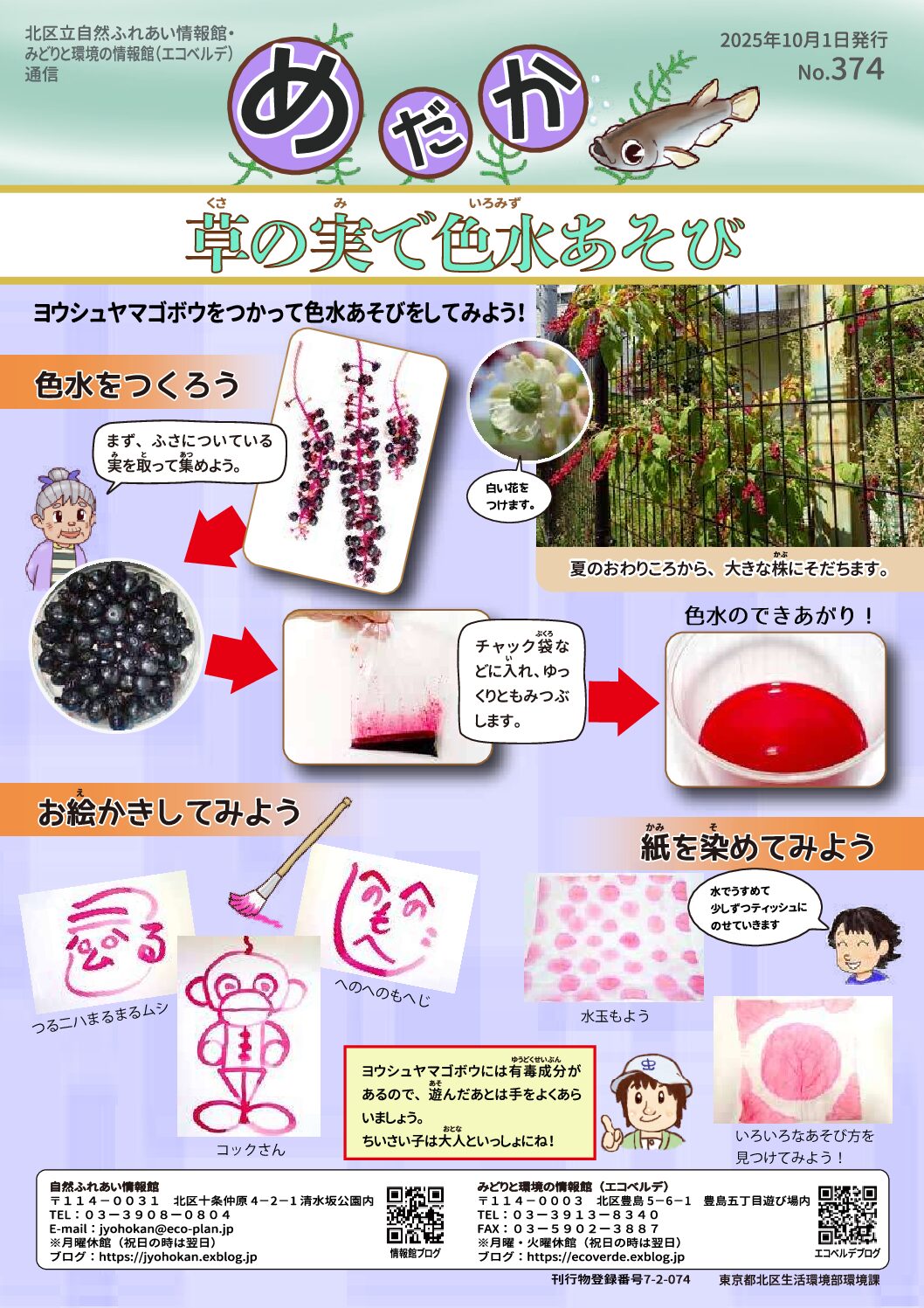 お知らせ 自然ふれあい情報館・みどりと環境の情報館(エコベルデ)通信「めだか」10月号 お知らせ 2025年10月3日 めだか10月号 https://www.city.kita.lg.jp/dev-environment/environment/1009900/1009945.html お知らせ一覧に戻る
