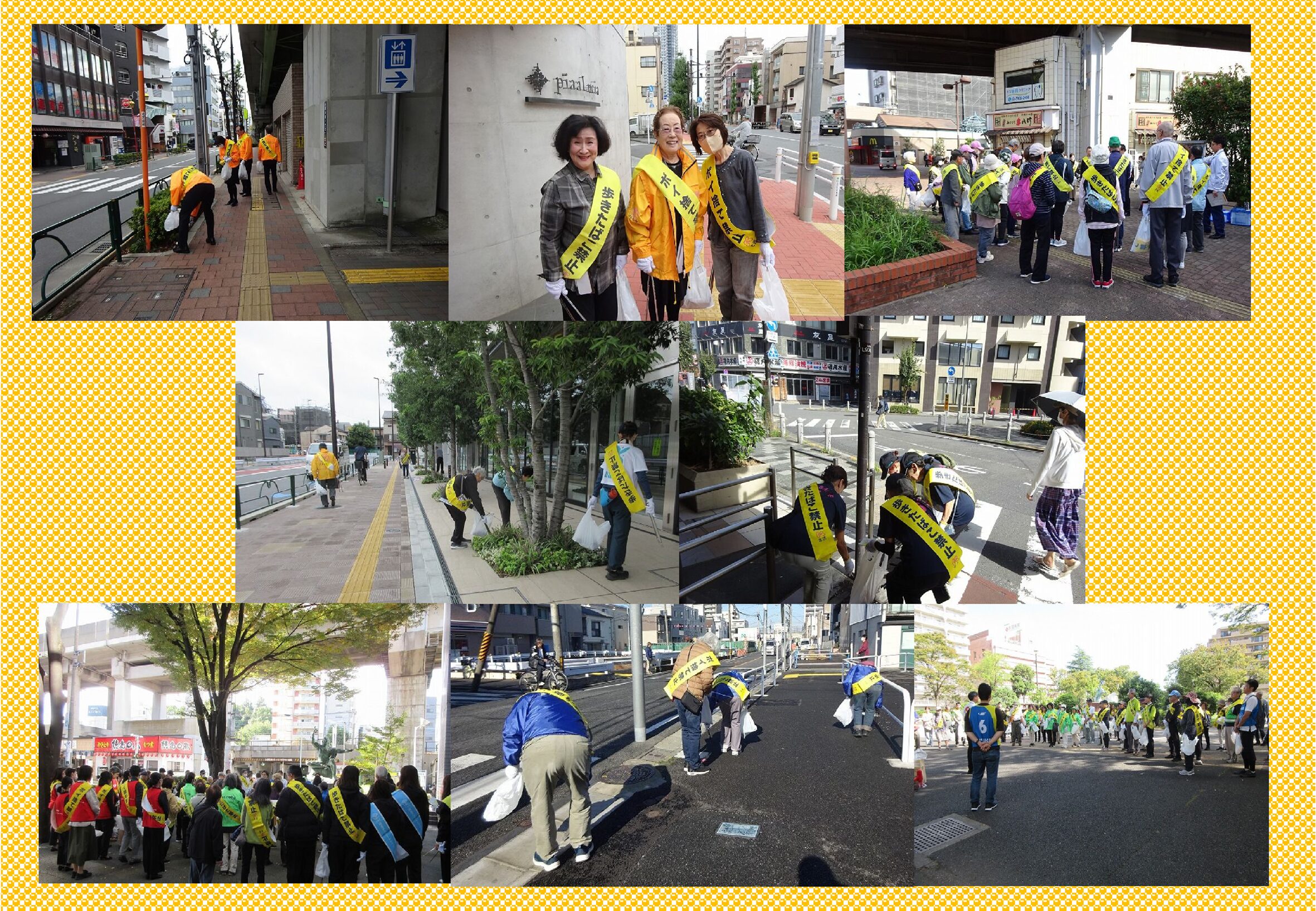 各駅周辺のごみ拾いを行い、駅頭で声掛けをしながら啓発用品を配布しました。